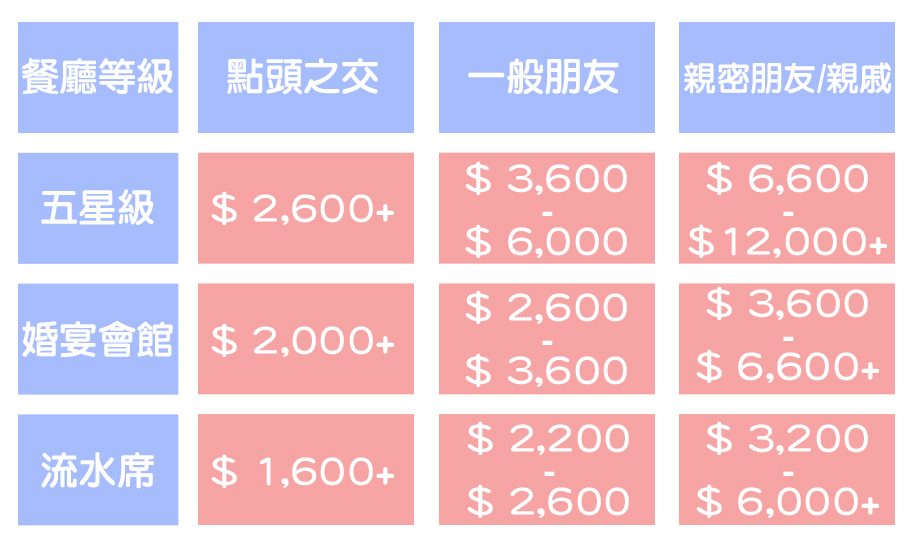 小撇步: 若有領取喜餅,建議在原定紅包金額上增加 $600 - $800,以貼補新人的餅錢。