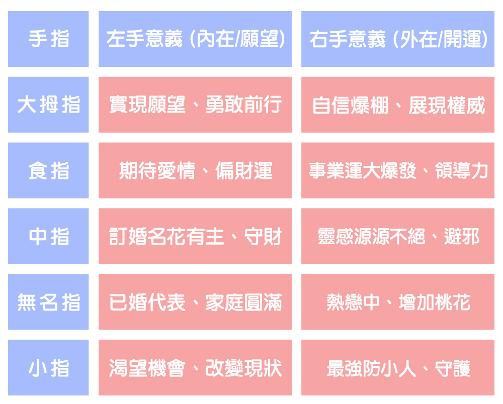 在細看每根手指前,先記住這個簡單的口訣:「左手代表婚姻與心願,右手代表戀愛與力量」!