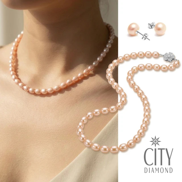 【City Diamond 引雅】天然 粉橘珍珠 項鍊 串鍊 耳環 套組(珠潤月詠系列)