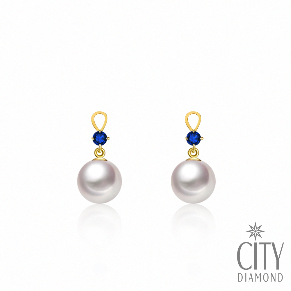【City Diamond 引雅】『詩人漫步』18K日本AKOYA珍珠6.5mm藍寶石黃K金短掛耳環(東京Yuki系列)